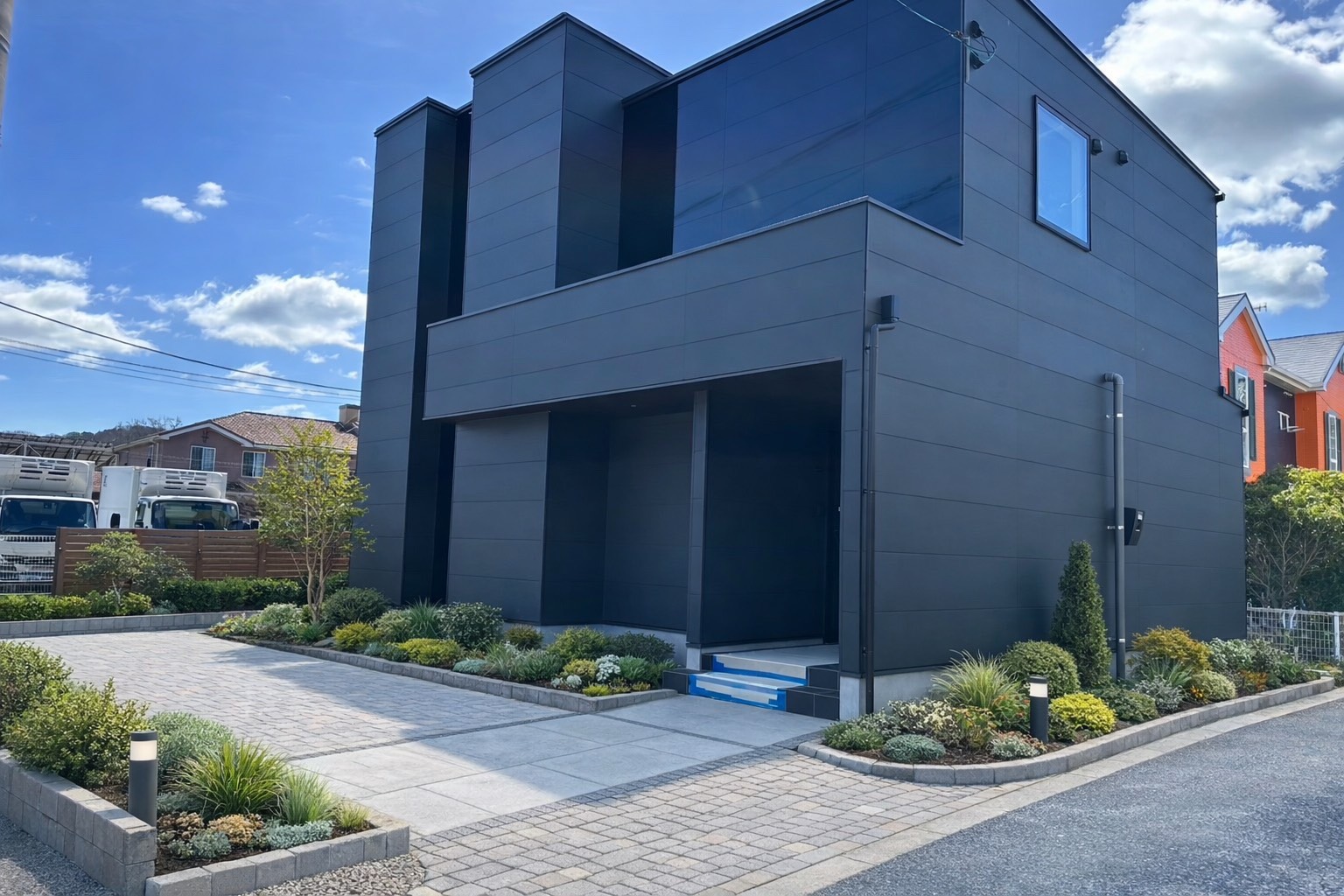 外観は、重厚感のあるブラックで統一。青空に映えるスクエアなフォルムと、空を反射する大きなガラス窓が、スタイリッシュで洗練された印象を与えます。道行く人が思わず振り返るような、美しく計算されたファサードです。