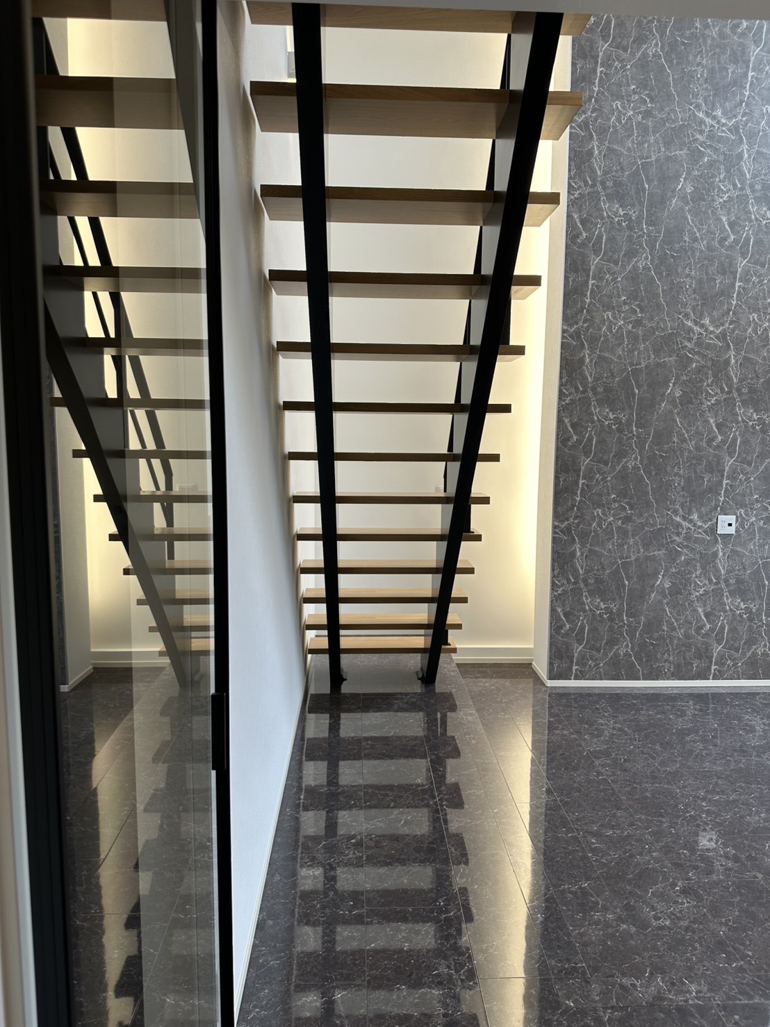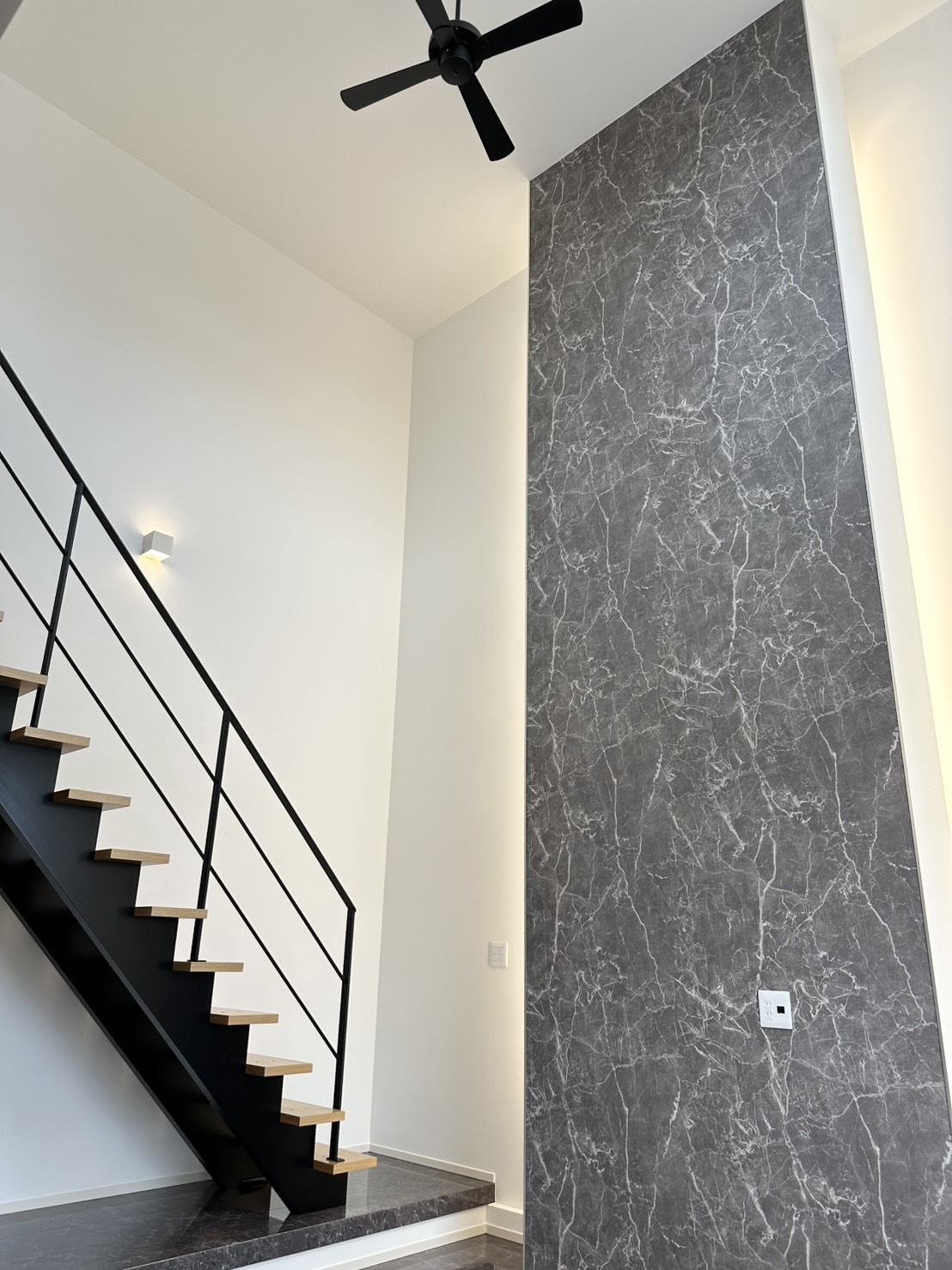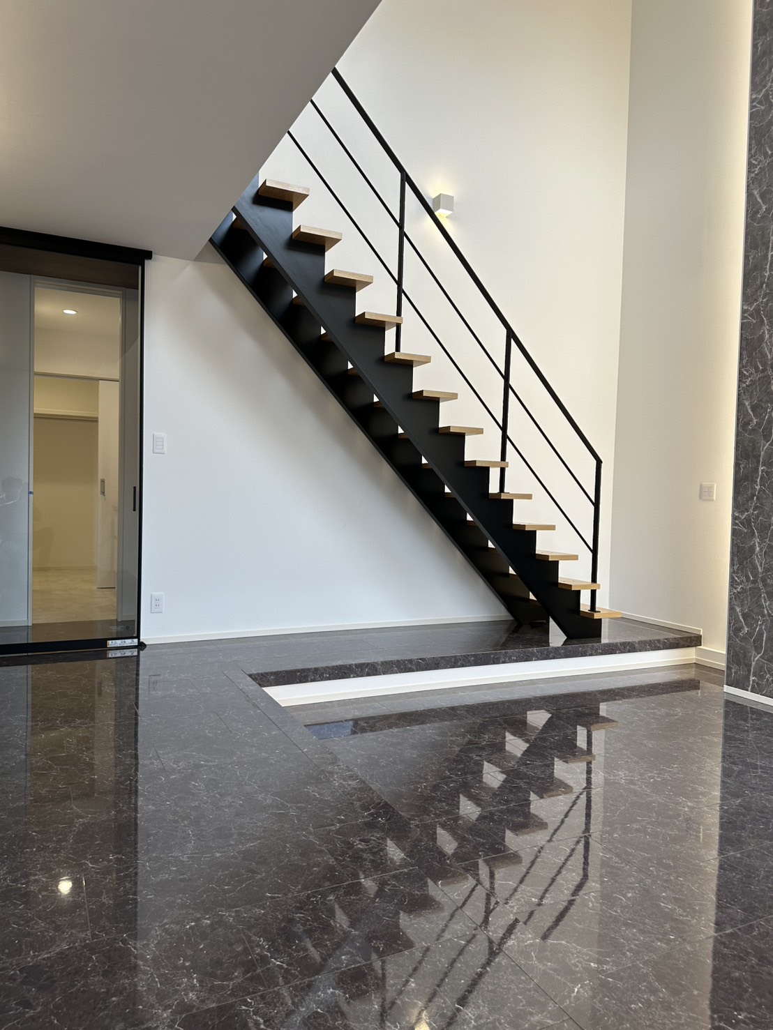 室内に入ると、ダイナミックな吹き抜け空間がお出迎え。空間を引き締めるブラックのアイアン階段と、天井まで伸びる石目調のアクセントウォールが、まるで高級ホテルのロビーのような非日常感を演出します。大理石調の床材に反射する光が、空間をより一層美しく魅せてくれます。