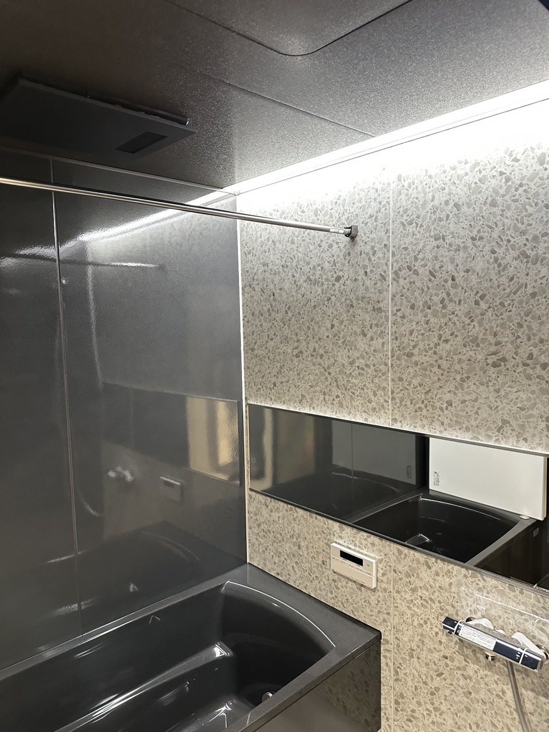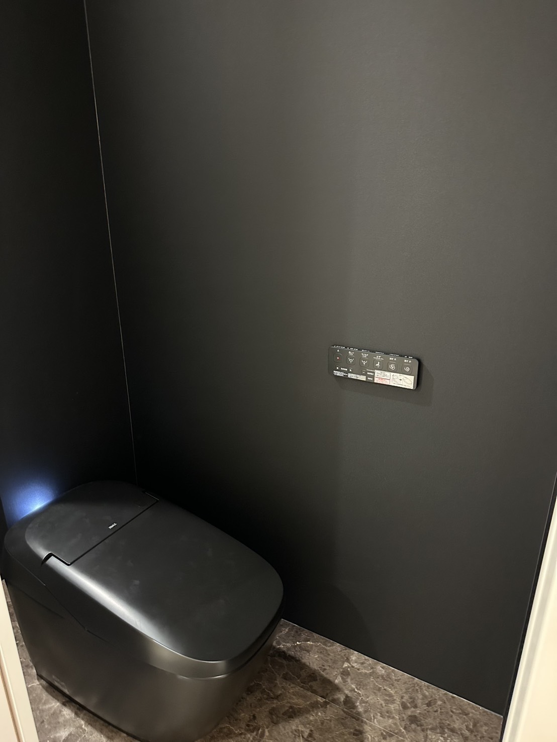 デザイン性だけでなく、日々の使い勝手にもこだわりました。広々と使える大理石調カウンターの洗面台は、間接照明が優しく顔を照らし、朝の身支度も特別な時間に。バスルームはダークトーンと石目柄のパネルを採用し、一日の疲れを癒す極上のリラックス空間に仕上げています。